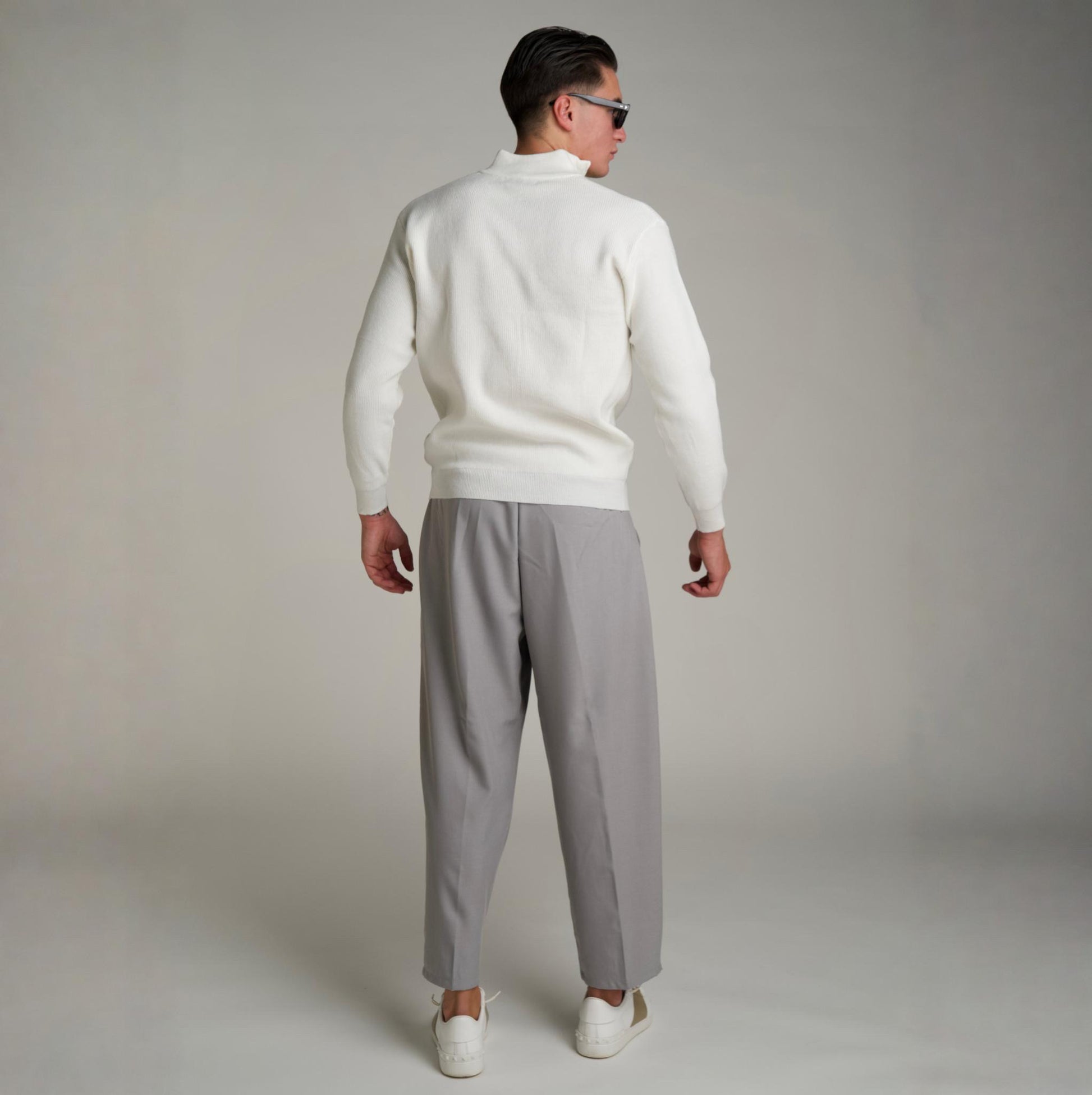 Coordinato composto da maglione con colletto e chiusura frontale con zip e pantalone elegante realizzati in tessuto raffinato. Maglione con vestibilità regular. Pantalone con vestibilità oversize, gamba ampia e tasche laterali inserite.